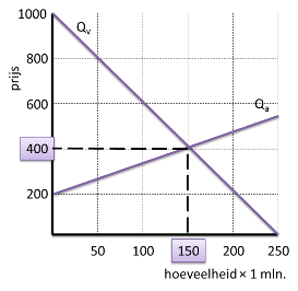 Bereken de evenwichtsprijs en de evenwichtshoeveelheid. |