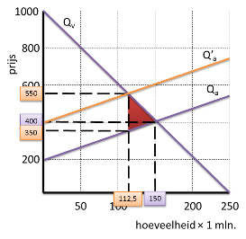 Bereken de omvang van de Harberger driehoek (het welvaartsverlies dat ontstaat door de heffing). |