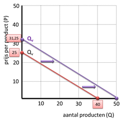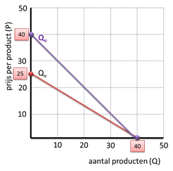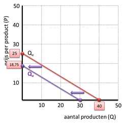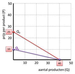 | Qv = -1,6p + 40 | Dit kan bijvoorbeeld veroorzaakt worden doordat het aantal consumenten is toegenomen, waardoor bij eenzelfde prijs meer gevraagd wordt dan voorheen. | Dit kan bijvoorbeeld veroorzaakt worden door een daling van het inkomen, waardoor bij eenzelfde prijs minder gekocht wordt dan voorheen. |