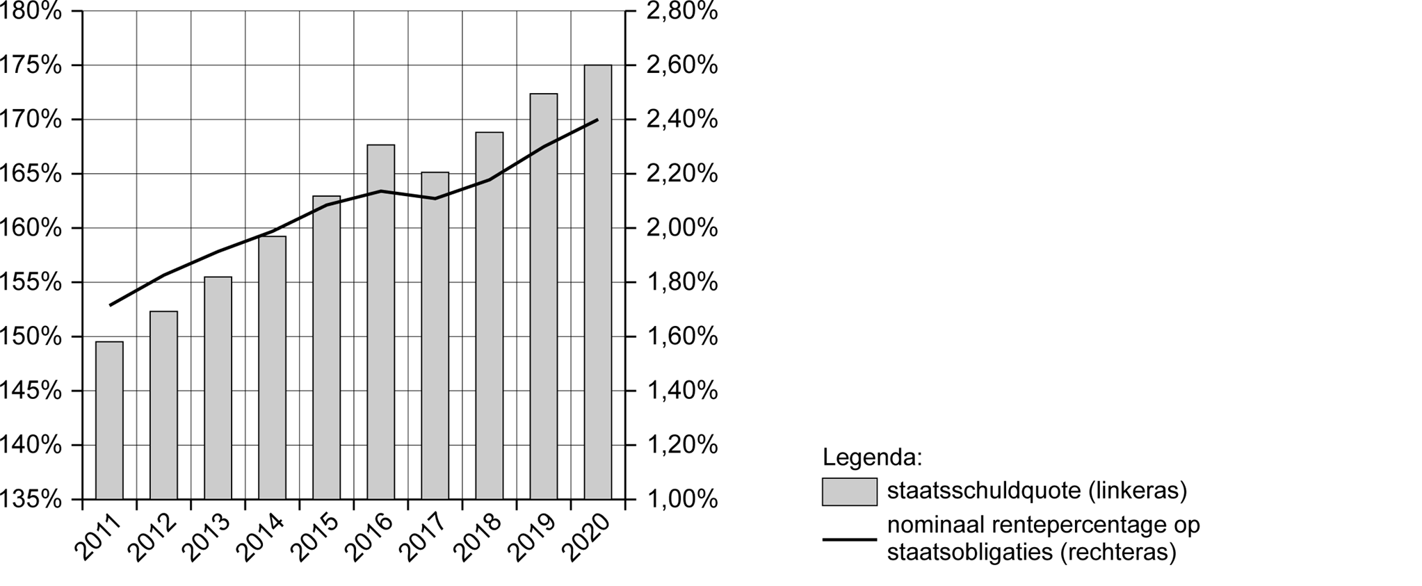Maecenates is een land dat al jaren kampt met een oplopende staatsschuld. Economen Falco en Colomba analyseren de houdbaarheid van de overheidsfinanciën en de doelmatigheid van de overheidsbestedingen in de periode 2011-2020 aan de hand van de gegevens in figuur 1.