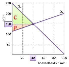 Arceer in de grafiek van vraag 1a het consumenten- en producentensurplus |