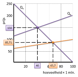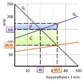 Arceer in de grafiek het totale bedrag dat gemoeid is met de subsidie. Splits de arcering in een consumenten- en producentendeel. |